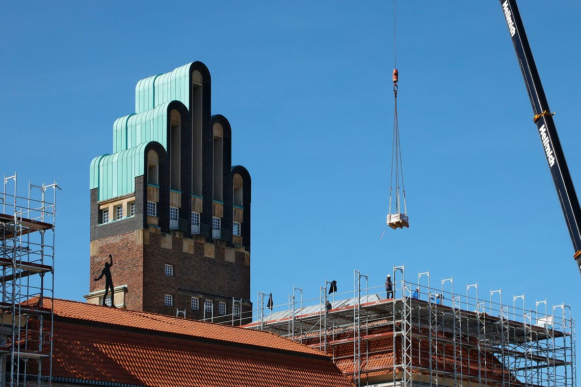 1907–08 wurde auf der höchsten Stelle der Mathildenhöhe, auf dem 1880 errichteten ehemaligen Wasserreservoir, das von Joseph Maria Olbrich geplante Ausstellungsgebäude errichtet. Es bildet zusammen mit dem ebenfalls für die „Hessische Landesausstellung für Freie und Angewandte Kunst“ erbauten Hochzeitsturm ein eindrucksvolles Ensemble, das das Stadtbild prägt.