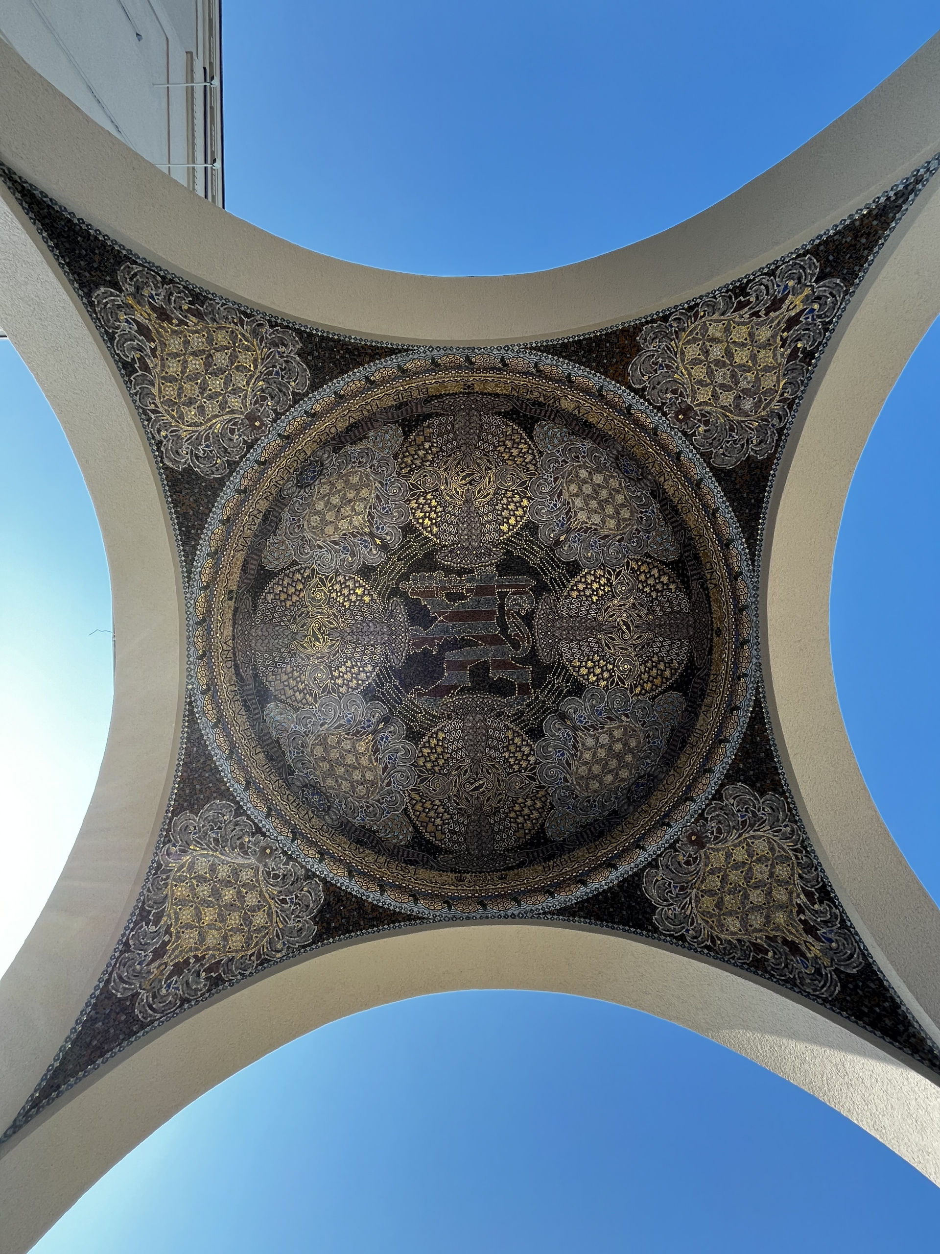 Der Aufgang zu den Ausstellungshallen beginnt mit einer kleinen Plattform, flankiert von einem ebenfalls von Olbrich entworfenen kupfergedeckten Brunnenhäuschen. Auf dem ersten Treppenabsatz gelegen bietet der von Granitsäulen getragene Pavillon eine erste Aussicht über das südliche und westliche Gelände der Künstlerkolonie. Ein kunstvoll gearbeitetes Mosaik wird von der Inschrift gesäumt: