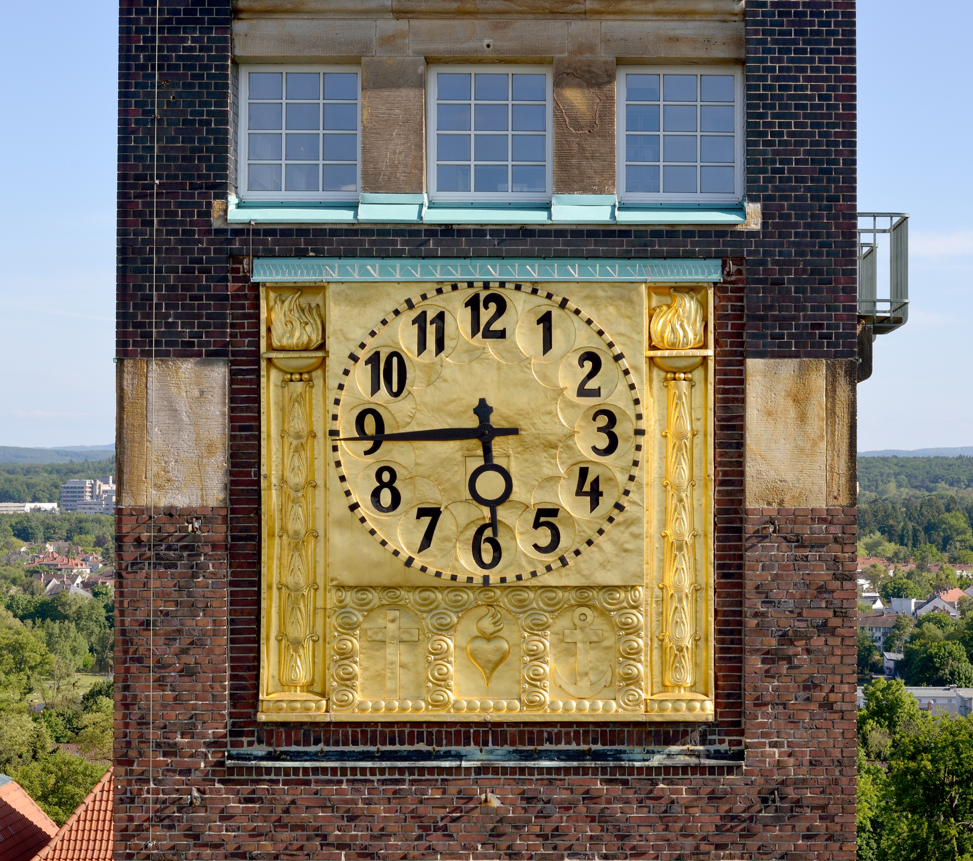 Für die Nordseite des Turms unterhalb der Fensterreihe auf Höhe der Aussichtsebene entwarf Albin Müller 1914 als Flachrelief eine große, vergoldete Uhr. Die schwarzen Zeiger und Ziffern heben sich deutlich von der golden leuchtenden Fläche ab. Das nahezu quadratische Feld wird von zwei aufrecht stehenden, goldenen Fackeln flankiert. Den unteren Zwischenraum schmücken Kreuz, flammendes Herz und Anker – die Symbole für Glaube, Liebe und Hoffnung.