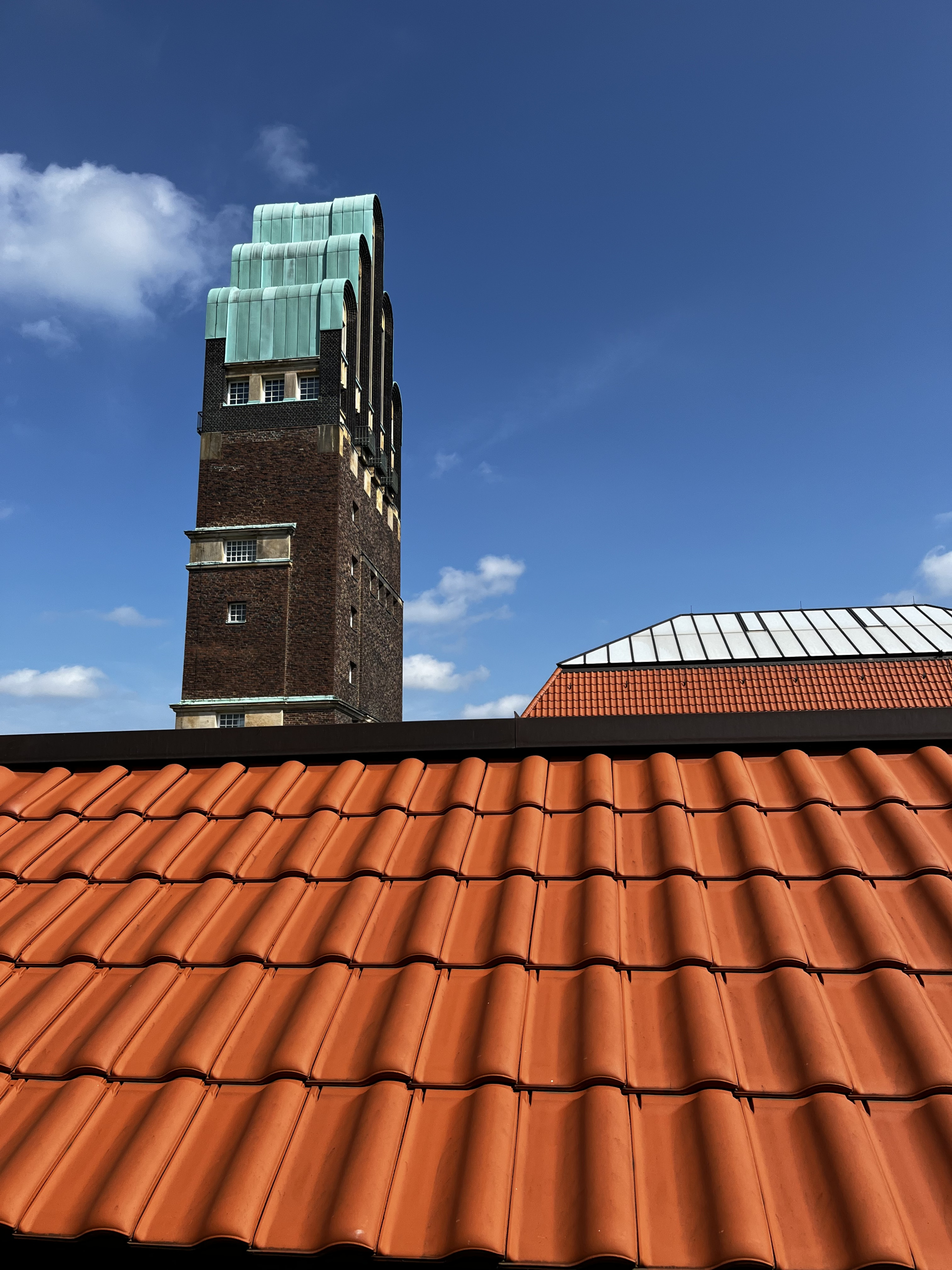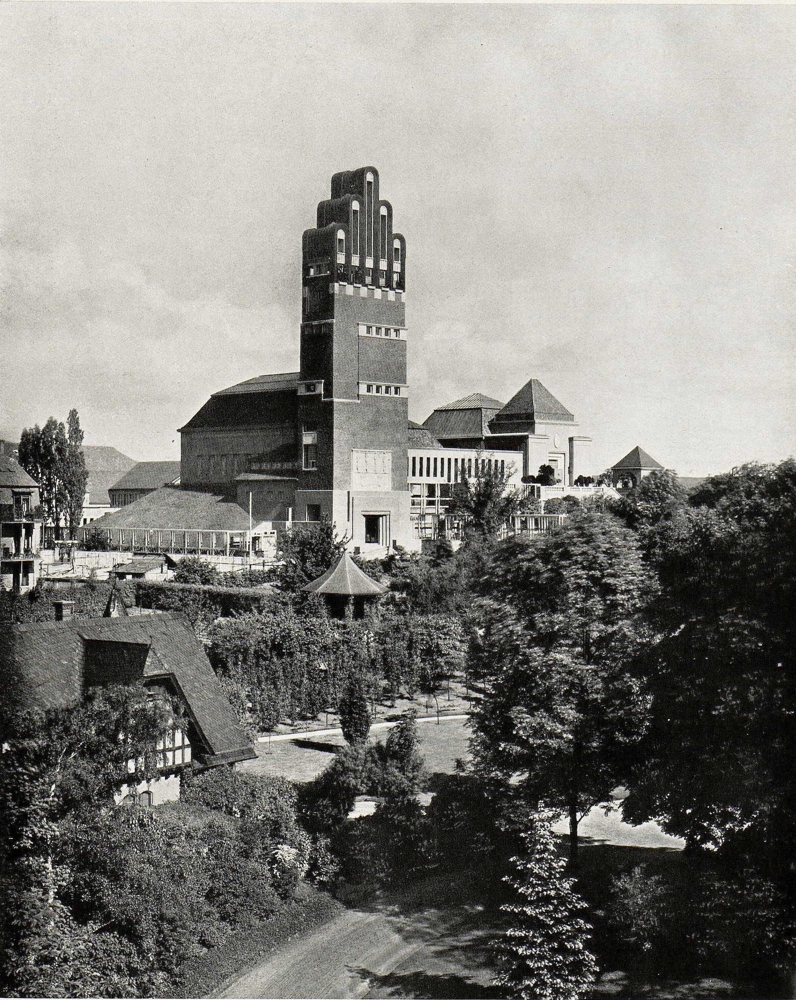 Mit seiner eigenwilligen, schlichten Form, der materialbetonten Außenhaut und den über Eck geführten Fensterbändern verweist die Architektur des Darmstädter Hochzeitsturms bereits auf die Zeit des Expressionismus.