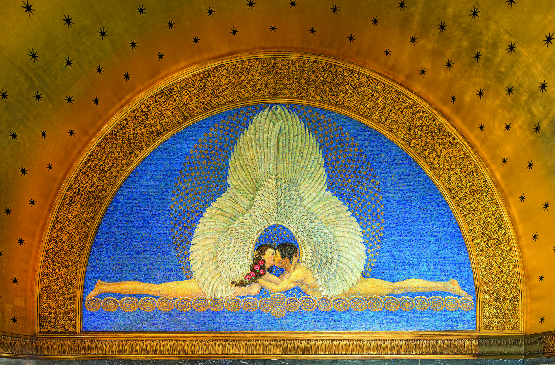 Auf der Nordseite wird mit dem Mosaikbild „Der Kuss“ oder „Die Treue“ ein nacktes, junges Paar gezeigt, das liegend, einander zugewandt, in innigem Kuss miteinander verbunden ist. Die idealen Körper werden durch ihre großen, nach oben geklappten Flügel überhöht, die von einem Sternenrund hinterfangen werden. Auf stilisierten, goldenen Rosen gebettet, verkörpert das jugendliche Paar in symmetrischer Anordnung eine absolute Harmonie.